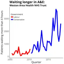 Failures against four-hour target in A&E. Quarterly figures from NHS England.[15]