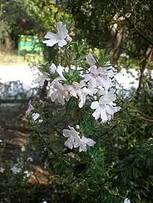 3mm (0.05-0.12 in) wide, emerging from white stems in whorls of four, with a silver-white abaxial surface and densely appressed hairs covering the leaves and stems.[3][2] Conspicuous, insect attracting flowers appear late Winter to Summer[3][4][5] with white to mauve petals and medium pink markings on the throat.[6] Influences are asymmetric and pedicellate, with solitary flowers emerging in the axils of new growth.[3] The corolla consists of five fused petals that are twice as long as the calyx and covered in sparse hairs. The lobes are narrow with two slightly wider petals at the top of the flower forming the upper lip and three narrower ones forming the lower lip. Calyxes are persistent and narrow-triangular with a tapered end, 5-6mm (0.20-0.24in) in length and over half as long as the tube.[3] The fruit consists of four, reticulate-rugose nutlets encased in a dry schizocarp, appearing after flowering, usually still encased by the calyx.[6][2] Reproductive parts consist of four stamens, with slightly pink-brown anthers, and a white pistil. The upper two stamens are fertile, while the lower two stamens are infertile, or staminode.[7]