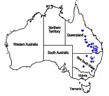 The species occurs in northern New South Wales and southern Queensland, on deep, gravel-rich, sandy soils, in mallee woodland and dry sclerophyll forest.[1]