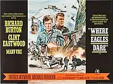 Where Eagles Dare is a 1968 British-American action adventure war thriller spy film directed by Brian G. Hutton and starring Richard Burton, Clint Eastwood and Mary Ure. It follows a Special Operations Executive team of men attempting to save a captured American General from the fictional Schloß Adler fortress, except the mission turns out not to be as it seems. It was filmed in Panavision using the Metrocolor process, and was distributed by Metro-Goldwyn-Mayer. Alistair MacLean wrote the screenplay, his first, at the same time that he wrote the novel of the same name. Both became commercial successes.