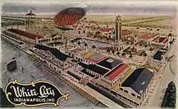 White City (also known as White City Amusement Park) was an amusement park in Indianapolis, Indiana, in what is now Broad Ripple Park that was in operation from May 26, 1906, until June 26, 1908. The trolley park was constructed and owned by the Broad Ripple Transit Company.[1] Similar to nearby rivals Riverside Amusement Park and Wonderland, White City was inspired by an exhibit in the 1893 World's Columbian Exposition in Chicago. Although the park's grand opening was immensely successful, White City's existence was the briefest of the three, having been open for two and one-half seasons before burning to the ground. Throughout the park's existence, advertisements touted White City as "the amusement park that satisfied".[2]