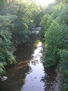 White Deer Creek is a freestone stream.[11] There are numerous strainers on White Deer Creek, to the point where the creek was described as "one of the most tree-infested and strainer-struck streams in the state".[13] The creek's channel is also braided in some reaches.[13] The creek flows through a very narrow valley and, in its upper reaches, is small for a canoeing stream.[13][14] The community of White Deer experiences significant flooding problems because it is on the creek's floodplain, and because of the creek's narrow valley.[14] The topography of the watershed is mountainous, with the creek's narrow valley being surrounded by steep ridges.[15] The watershed was described as rugged, with sharp topographical features, in a 1938 report. The watershed is not affected by glaciation, as it is approximately 30 miles (48 km) south of the glacial moraine.[12]