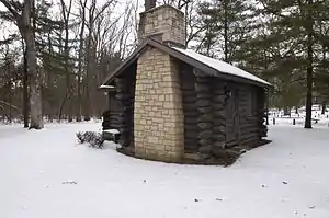 After the lodge was completed, it was decided to build a restaurant and breezeway onto the lodge building.[4] Logs for most of the project were shipped via railroad from as far away as Oregon and Washington state, unloaded in Stratford, Illinois and dragged to the construction site by teams of horses. The CCC project also completed sixteen[5] one room log cabins and three four-bedroom cabins. The work crews also built picnic shelters, trail shelters and foot bridges. Only the logs for the cabins came from another source.[4] They were purchased from a salvage company that had purchased utility poles from a defunct utility company at the price of 30 cents a piece.[4]