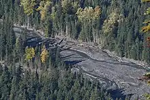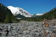![]() Emmons Glacier (left) on the northeast side of Mount Rainier, the source of the White River (lower left) | |