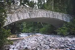 The White River Bridge was built in 1929 in Mount Rainier National Park as part of the Yakima Park Road project. The new road was planned to open up access to the northeastern portion of the park. The bridge, spanning the White River, was built by contractor John D. Tobin of Portland, Oregon, who had previously built the Narada Falls Bridge and the Christine Falls Bridges, both listed on the National Register of Historic Places. Plans for the bridge were drawn by the National Park Service Branch of Plans and Designs in the National Park Service Rustic style, with construction supervision by NPS landscape architect Ernest A. Davidson. The three-centred arch spans 60 feet (18 m), with a stone-faced concrete structure.[2]