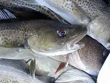 Whitefish or white fish is a fisheries term for several species of demersal fish with fins, particularly Atlantic cod (Gadus morhua), whiting (Merluccius bilinearis), haddock (Melanogrammus aeglefinus), hake (Urophycis), and pollock (Pollachius), among others. Whitefish (Coregonidae) is also the name of several species of Atlantic freshwater fish.