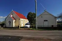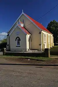 The first wooden church was used as the area's school from 1857.[36] This dual use of the church as a school has been stated, by local historian Ivan Heazlewood, as likely to be planned from the beginning. The area was more heavily populated in the past than in the 21st century due to a large number of tenant farmers with large families.[37] Heazlewood speculated that the later 1865 church was probably used for classes due to the small size of the wooden school building.[38] The school grew to around 100 pupils on the register in 1900.[38] The church building, also used for Wesleyen Sunday school, was used as a school until 1929. For this period the Education Department rented it from the Church trustees. A new school was built, on donated land, opposite the church and next to the recreation ground. This state school was opened in a ceremony on 23 August 1929.[22] The school remained open as late as the end of 1954.[39]