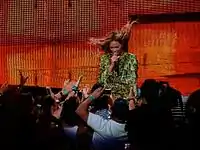 Beyoncé performed "Why Don't You Love Me" live for the first time the 2011 Glastonbury Festival on June 26, 2011. During the performance she danced with her male backup dancers and the official video of the song was played on a screen behind them.[60] Later, in May 2012, Beyoncé performed a funky version of the song as a part of her revue show Revel Presents: Beyoncé Live in Atlantic City, New Jersey at Revel.[61][62] While reviewing the show, Ben Ratliff of The New York Times wrote: "Then she makes some of the most thorough and gold-plated declarations of self-worth ever rendered in pop. 'There’s nothing not to love about me,' she sang... without needing to make a joke out of it."[63] Maura Johnston of The Village Voice was also positive about the performance of the song, saying, "Live, she threw herself into the track, from tsk-tsk-tsk opening to impassioned ending; after that, the song's frenetic beat got transformed into an extended outro that showcased her band's prowess in such a convincing way, she took off her shoes to dance along with it."[8] "Why Don't You Love Me" was included in the set list of Beyoncé's The Mrs. Carter Show World Tour (2013-2014).[64]