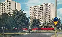 The large panel system-buildings of the neighbourhood of Skarpa Puławska, as seen from Puławska Street, in the 1960s.