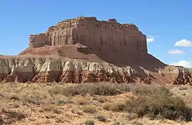 This butte is set within the San Rafael Desert on the southeastern edge of the San Rafael Swell. Wild Horse Butte is composed of four exposed formations of Jurassic rock. The top layer is Morrison Formation caprock. The Morrison Formation is famous for dinosaur bones found within it. Although no dinosaur bone discoveries have been reported on Wild Horse Butte, they have been found just west in this formation. This overlays the cliff-forming Summerville Formation, which consists of distinctive, thin beds of shale, siltstone, and sandstone. Thin beds and veinlets of gypsum found within the shale suggest a dry climate where ponded tidal water readily evaporated. Below Summerville is the slope-forming, lightly-colored Curtis Formation. The bottom layer is dark, reddish Entrada Sandstone, which is also the composition of the hoodoos that give Goblin Valley its name.[4]