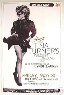 The Wildest Dreams Tour is the ninth concert tour by singer Tina Turner. The tour supported her ninth studio album Wildest Dreams (1996). The tour is Turner's biggest outing to date, performing over 250 shows in Europe, North America and Australasia—surpassing her Break Every Rule Tour. Lasting nearly 16 months, the tour continued her success as a major concert draw. The European leg alone sold 3 million tickets and generated an estimated US$100 million.[2][3] The tour further grossed around US$30 million in North America.[3] It was sponsored by Hanes, as Turner became the spokesperson for their new hosiery line.[4]