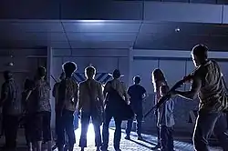 In "Wildfire", Andrea shoots her deceased sister Amy after she slowly resurrected into a walker. Greg Nicotero, the special effect director for The Walking Dead, made Bell wear contact lenses that were less harsh in appearance, as he wanted an emotional connection to resonate between the characters. Bell admitted that she was perplexed on how to approach the scene.[6] "I laid down on the wood chips and just sort of stared at the sky and staring at my sister's face," explained Bell. "All of these thoughts and emotions started flooding in, so I was really lucky."[6] Jim, played by Andrew Rothenberg, also died in this episode, bitten by a walker, and is abandoned.[8] His death is considered the 35th most important death in the series.[9] Adam Minarovich played Ed, Carol's husband and first victim of the series.[10] It is the last appearance of Morales, played by Juan Pareja,[11] and his family (Maddie Lomax and Noah Lomax as Eliza and Louis Morales, his children,[12][13] and Viviana Chavez as Miranda Morales, his spouse),[14] until his return in the season 8 episode 2 named The Damned.[15]