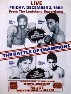Following the cancellation of the "This Is It" card, Madison Square Garden officials were still interested in including the Benítez–Hearns fight on the undercard of the rescheduled Ken Norton–Gerry Cooney fight set for May 11, 1981.[4] Despite an offer of around $700,000, Benítez and manager Jimmy Jacobs rejected the offer in favor of a less–lucrative fight that would see Benítez moving up in weight and challenging WBC light middleweight champion Maurice Hope for his third world title.[5] Benítez would defeat Hope to become the youngest three–division world champion in boxing history at the time.[6] He would then make two successful title defenses against Carlos Santos and Roberto Durán before an agreement was reached in October 1982 to face Hearns on December 3 of that year.[7] The Benítez–Hearns fight was promoted by Don King with a co–main event featuring a super bantamweight championship fight between Wilfredo Gomez and Lupe Pintor in a fight card dubbed "The Carnival of Champions."[8] The massive Louisiana Superdome was chosen as the site for event and it was expected to draw a crowd of 40,000. However, ticket sales fell well short of expectations and King convinced Benítez and Hearns to take a $250,000 pay cut from their original $1.5 million purses, while Gomez and Pintor's purses of $750,000 were reduced by $125,000 in order to save the event.[9]