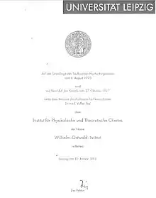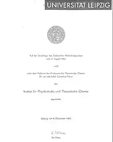 Right at the beginning of the GDR period, the universities were to be transformed from "civil universities" into state-controlled and organized universities.[1] There were the so-called university reforms, carried out by the State Secretariat for Higher and Technical Education. In the course of the reforms, the State Secretariat significantly changed the content and structure of the universities, which of course also affected the Physico-Chemical Institute in Leipzig.[1][2]