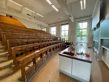The U-shaped building had been furnished according to the most modern standards of the time: In the basement there was a large and a small battery, on the 1st floor there was a large workroom and equipment rooms, and on the 2nd floor there were two lecture halls (with 140 and 42 seats, respectively). In the attic there was a geological collection. There was also a director's apartment, located in the middle of the institute building and connected to the rest of the building by a corridor.[1]