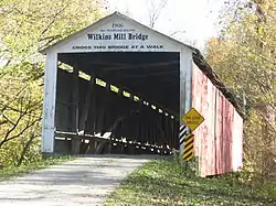 The Wilkins Mill Covered Bridge is north of Rockville, Indiana, United States. The single span Burr Arch Truss covered bridge structure was built by William Hendricks in 1906. The bridge is 120 feet (37 m) long, 16 feet (4.9 m) wide, and 13 feet (4.0 m) high.[4][5]