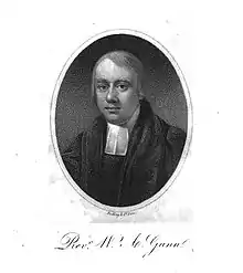 Moving to London, Gunn was lecturer at St Mary Somerset with St Mary Mounthaw, from 1793.[6] He came into the orbit of John Newton, a significant influence, at St Mary Woolnoth. Newton tried in 1795 to bring him to St Helen's Bishopsgate, but failed, because of local resistance. In 1796 Gunn became Newton's curate at St Mary Woolnoth.[8][9] Newton found Gunn both popular with his congregation and humble; but noted that Gunn was even more unpopular with the wider clergy than evangelicals generally were.[10] Joseph Irons, father of William Josiah Irons, who became an itinerant preacher, was converted by Gunn's preaching, around 1803.[11] Another impressed by Gunn was Jacob Kirkman Foster, who became a Cheshunt College tutor.[12] An opponent took the chance to criticise Gunn for his use of snuff.[13]