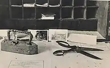 "Shears and goose" are traditional symbols of the tailoring profession; William Andrew Johnson recalled warming up a flat iron, like the one pictured, for pressing Johnson's suits (Andrew Johnson, Plebeian and Patriot, 1928)