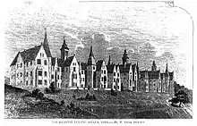 In 1846 Atkins received one of the largest public commissions in Cork city, to build the Cork City and County Asylum. This commission, commonly and latterly known as Our Lady's Hospital, Cork, was received from the Board of Works. It was being angled for, at the time, by the more established Cork architect Thomas Deane who was then engaged in the building of Queen's College Cork.[2] Built in a revival Gothic style between 1846 and 1853, this is popularly held to have the longest corridor in all of Europe. The building was partly converted into an apartment development known as "Atkin's Hall".[3]