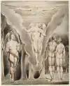 There are twelve plates in each of the Paradise Lost sets, one for each of the books in the poem. While some of these, such as Satan, Sin and Death: Satan Comes to the Gates of Hell, depict specific scenes from the epic; others, such as Satan Watching the Endearments of Adam and Eve, are syntheses of several scenes.[1] In the latter case, Blake employed visual barriers to separate the elements from different scenes, such as the arc of the bower in Satan Watching the Endearments of Adam and Eve.[2]