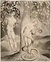 In Blake's mythology, Albion's fall from a divine androgyny to a sexual nature divides him into the Four Zoas, their spectres (representative of hypocritical morality), and their emanations (female halves). In the Paradise Lost illustrations, Adam is analogous to the fallen Albion, Satan to Adam's Spectre, and Eve to Adam's emanation.[3]