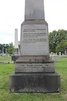 He died while in office as US Attorney General in 1795. He was buried with his wife's family in Saint Mary's Episcopal Churchyard in Burlington, New Jersey.[4] A cenotaph for Bradford was built at his family's burial plot in Laurel Hill Cemetery in Philadelphia.