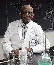 On his return, Davis completed his B.S. degree in chemistry at Talladega College, graduating in 1956. He was one of three students chosen for a George Washington Carver research fellowship to attend Tuskegee Institute in 1956.[9] At the time, it was almost impossible for a black scientist to train for a professional career in research in the United States. Even at Tuskegee, the usual career track was to train as a teacher, with a specialization in one's area of interest.[10][11] Davis was determined to do research. He worked with Clarence T. Mason of Tuskegee and studied the hydrolysis rate of compounds in jet fuel. This research enabled him to meet Wernher Von Braun of the U.S. Space & Rocket Center. Davis received his Master of Science degree in organic chemistry from Tuskegee in 1958.[5]