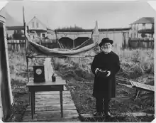 William Duncan late in life, exhibiting to friends for photographing the canvas hammock, clock, water bottle, and accordion used by him on his voyage to Victoria, B.C., in 1856–57. 1916–1917, From the Wellcome Foundation collection at the National Archives and Records Administration.