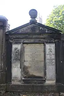 He is buried in St Cuthbert's Churchyard at the west end of Princes Street.[6] He lies on a main dividing wall within the churchyard, to the north-west of the church, with his grandfather Alexander Pitcairn.