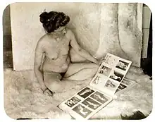 While some of the pictures appear to have been taken at Shearer's house, others include props, sets, and costumes characteristic of a professional photographic studio such as the set of images showing a crescent moon and others in which women are shown draped like Greek goddesses or praying.[13] Johnson searched archives in Pennsylvania and found no evidence that the images were distributed, nor does he believe that they were used as a catalogue for male customers as the high turnover of women in an establishment like Shearer's made that impractical. It is notable throughout how relaxed the women are in front of the camera, indicating that they were in the presence of someone they trusted, although some hide their faces.[11]