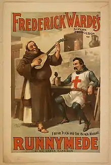 In 1894 Harrison wrote Runnymede, a play based on the story of Robin Hood and written for the Shakespearian actor Frederick Warde.[14] Harrison's treatment portrayed Robin Hood's band not as outlaws, but as loyal subjects of Richard Coeur de Lion, in opposition to John of Anjou. The story was based on the attempts of John to destroy Robin and to gain possession of Marian Lea, Robin's affianced bride. A secondary romance was woven around the love life of Little John of Robin Hood's band and Margery Josselyn, Marian's companion. Harrison introduced some changes to historical fact for dramatic effect – for example, King Richard I was murdered by his brother John; and having become King, John's death sentence upon Robin Hood and Friar Tuck was frustrated by his having just signed the Magna Carta.