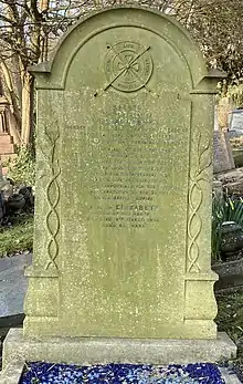 He died in the St Pancras district of London, aged 68.[6] He was buried with his wife Elizabeth at Highgate Cemetery, with a memorial above the grave paid for by members and friends of the Royal Life Saving Society.