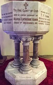 Baptism font | St Peter's Cathedral, Hamilton | 1933 | Monumental marble carving. |