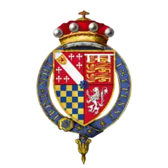 On 2 January 1554 he was appointed to meet the Spanish ambassadors who had come to London to negotiate a marriage between Queen Mary I and King Philip II of Spain.[15] Wyatt's rebellion broke out on 25 January, and Howard was among those who raised the militia to defend London. On 7 February 1554 he held Ludgate, preventing the rebels from entering the city and leading to their surrender a few hours later.[16] He was appointed to Queen Mary's Privy Council on 3 January 1554, and on 11 March was created Baron Howard of Effingham. On 20 March 1554 he was granted a patent as Lord Admiral, replacing Lord Clinton. On 9 October of that year he was made a Knight of the Garter.[17] Around this date there was a masque at court, featuring mariners' costumes made of gold and silver cloth, which Francis Yaxley thought was Howard's production.[18]