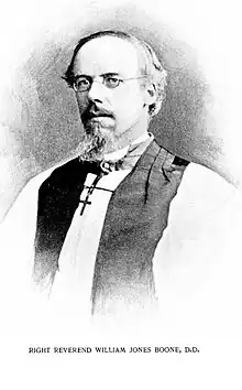William Jones Boone (17 May 1846 – 5 October 1891) was the fourth Anglican missionary bishop of Shanghai.[1] Boone was born in Shanghai, son of and namesake of William Jones Boone and his wife Sarah Amelia De Saussure Boone.[2] After his mother’s death, he and his brother were taken to the US for their education.[3]