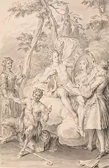 King thought himself badly treated in the course of his Irish lawsuit, and attacked his enemies in a mock-heroic poem, in two books, called The Toast (alleged to have been originally composed in Latin by a Laplander, "Frederick Scheffer", and translated into English, with notes and observations, by "Peregrine O'Donald, Esq.") The heroine, "Mira", is the Countess of Newburgh, who had secretly married as her third husband Sir Thomas Smyth, King's uncle.[2] King portrayed her as a lesbian.[14][15] It was published at Dublin in 1732. Swift praised it, and The Toast was completed in four books, inscribed to him, and printed in London (1736), with a frontispiece by Hubert-François Gravelot (engraver Bernard Baron);[16] it was reissued in 1747. In his old age King regretted many passages, and at his death the remaining copies were burnt. The poem was reissued without the annotations in John Almon's New Foundling Hospital of Wit. A key to the characters is given in William Davis's Second Journey round the Library of a Bibliomaniac (1825).[2]