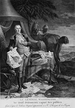 A French engraving, circa 1780, showing General Washington holding the Declaration of Independence. The black man with the horse is not identified but may represent Lee.