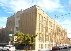 Its historic school building was designed by Irwin T. Catharine and built in 1930–1931. It is a 16 bay, yellow, white, and brown brick building on a limestone base in the Art Deco-style. It features pronounced molded brick mullions, two Gothic arched entrances, and brick piers.[3]