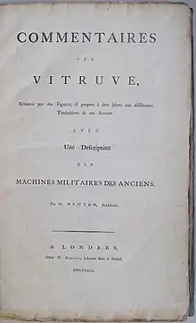 In 1771 Newton published the earliest English translation of the first five books of Vitruvius, as De Architectura libri decem, written by Marcus Vitruvius Pollio. In 1780 he issued, in French, Commentaires sur Vitruve, with many plates. The complete work of Vitruvius (including a translation of the remaining five books) was published after Newton's death in two volumes, 1791, by his brother and executor, James Newton. Of the plates, a few only were by William, the majority being by James.[1]