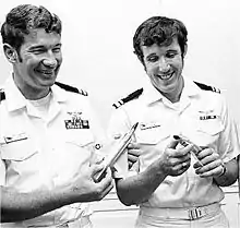 ![]() Lieutenant William P. Driscoll (right) and Lieutenant Randall H. Cunningham in a ceremony honoring them in June 1972 | |