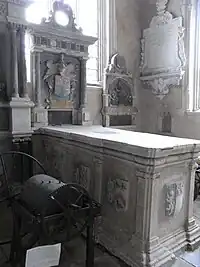 Monument to Katherine Popham (d.1588), wife of William Pole (1515-1587), Pole Chapel, Colyton Church. To the left is the red marbleised monument of her grandson Sir John Pole, 1st Baronet (d.1658) and to the left is the monument to her husband. On the base of her monument is a large depiction of the Pole arms on a white strapwork surround