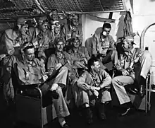 Kane subsequently became commanding officer of VF-10 after Flatley returned to the United States in February 1943, following the end of the Guadalcanal campaign. The rest of 1943 proved relatively uneventful for the Enterprise air group, as the carrier returned back to Pearl Harbor, returning to action towards the end of the year.[16] Between 29 January and 4 February 1944 Enterprise launched strikes against Japanese forces on Taroa and Kwajalein in support of the amphibious landing in the Battle of Kwajalein. During the strikes against Taroa, Kane overcame poor weather conditions in leading the fighters to the island, where they destroyed numerous aircraft on the ground. Over Kwajalein Kane "effectively led numerous strikes" that destroyed an ammunition dump. Determined to keep a flying role, Kane refused a promotion to Enterprise air officer and instead became commander of the Enterprise Air Group shortly before the Operation Hailstone airstrikes against the Japanese base on Truk Island between 17 and 18 February. On the first day of the strikes, Kane led the first fighter sweep over the island, downing three Japanese Zeroes and then strafing parked aircraft.[17] For directing his fighters "skillfully and coolly against enemy air opposition," and his leadership during the earlier Taroa and Kwajalein strikes, Kane was awarded the Distinguished Flying Cross.[18] Bombing Squadron 10 (VB-10) commander James D. Ramage praised Kane for his leadership: "Killer was just great...he ran things very low-key but competently," as well as his radio discipline. Kane was also known for his nearsightedness but applied his "forceful personality" to remain on flight status.[19] The Enterprise continued to launch strikes against Japanese forces in the Marshall and Caroline Islands and supported the Hollandia landing, between 20 February and 30 April. During strikes against Palau and Truk, Kane was credited with assisting in the downing of two Japanese aircraft. For his "skillful" leadership during these operations, Kane received a Gold Star to his Distinguished Flying Cross.[18]