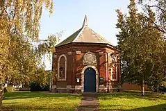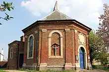 • Moulton Chapel, St James Moulton. The original church is brick and octagonal in form. Each side of the octagon has a pair of giant pilasters of the Doric order, similar to the pilasters on the façade of Fydell House. The doorway and widows are arched and the interior has a domed roof. A baroque date inscription is present. The Spalding Gentlemen's Society has a drawing by John Talman showing that the architect had originally intended to surmount the building with a cupola.[5] It can be compared with the less ornate octagon Preskbyterian and later Unitarian Octagon Chapel of 1756 in Norwich, which is thought to have been inspired by the architecture of the Low Countries.[6]