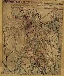 After emerging from their winter quarters at Culpeper on May 3, 1864, Sands and his fellow 88th Pennsylvanians were then assigned to Lieutenant-General Ulysses S. Grant's Overland Campaign, during which they fought in the battles of Spotsylvania Court House (on May 8 and 12), North Anna (May 23), Totopotomoy Creek (May 26), and White Oak Swamp (June 12) before engaging with other Union troops in the Siege of Petersburg, during which time Sands and his regiment charged and routed the enemy from various entrenched positions while under heavy artillery and sharpshooter fire. Afterward, they continued to support siege operations.[20]