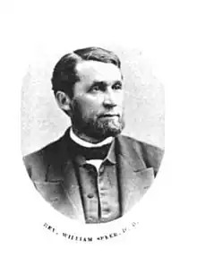 William Speer (1822–1904) was an American pioneer Presbyterian missionary and author. He was missionary to the Chinese in Canton (1847–1850), where he helped establish the first Presbytery in Canton, and to the Chinese in California (1852–1857), where he founded the first Chinese Protestant church outside of China and became a strong advocate for the Chinese in California. Later (1865–1876) he served in Pennsylvania as the Secretary of the Presbyterian Board of Education.[1][2]