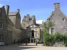 William Stewart became a gentleman of the king's bedchamber in May 1594. He helped save the king from the Gowrie Conspiracy at Perth on 5 August 1600 and James VI rewarded him with the forfeited Ruthven castle of Trochrie near Little Dunkeld and the barony of Strathbran.[5] A privy seal letter of November 1600 describes him as a "daily servitor" of the king.[6] He is said to have made additions to Trochrie Castle which featured his initials and heraldry.[7]