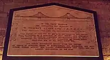 Tierney Clark lived and died in Hammersmith in Middlesex. His memorial in the local parish church, St Paul’s, shows an outline of his design for the nearby bridge. His bridge has since been replaced by a later one designed by Sir Joseph Bazalgette, which reuses the Tierney Clark pier foundations.[3]