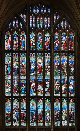 Wailes' west window at Gloucester is a stupendous achievement, and not just because of the technicalities involved in glazing such a vast area. It makes no attempt to imitate the style or content of the east window. The content of the west window, like that of so many other commissions, was probably stipulated by a committee. Because the window was so large there was room for a large number of narratives and many figures.