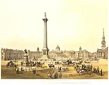 Wilkins was influential in the development of London's Trafalgar Square, which had been opened up as part of a scheme by John Nash. He campaigned to have the new building for the National Gallery sited on the north side of the square, initially suggesting that the existing building, William Kent's Great Mews should be converted for the purpose.[11] The government accepted the idea, but opted for a wholly new building, and a Neoclassical design by Wilkins was accepted over alternative schemes by Nash and CR Cockerell.[11] Wilkins also drew up plans for the laying out of the square itself. They were not put into effect, although the scheme eventually carried out by Charles Barry after Wilkins' death replicated many of his ideas.[12] The appearance of the National Gallery (1832–38), which was originally shared with the Royal Academy, attracted adverse criticism from the beginning.[13] John Summerson concluded in 1962 that although Wilkins' frontage has many virtues "considered critically as a façade commanding a great square, its weakness is apparent".[14]