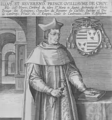 Cardinal Guillaume, Guillermo or William de Croÿ (1497 6 January 1521), a member of the noble House of Croÿ, was Prince-Bishop of Cambrai from 1516 to 1519 and Archbishop of Toledo from 1517 to 1521. He was born in the Habsburg Netherlands and died in Worms, Germany.